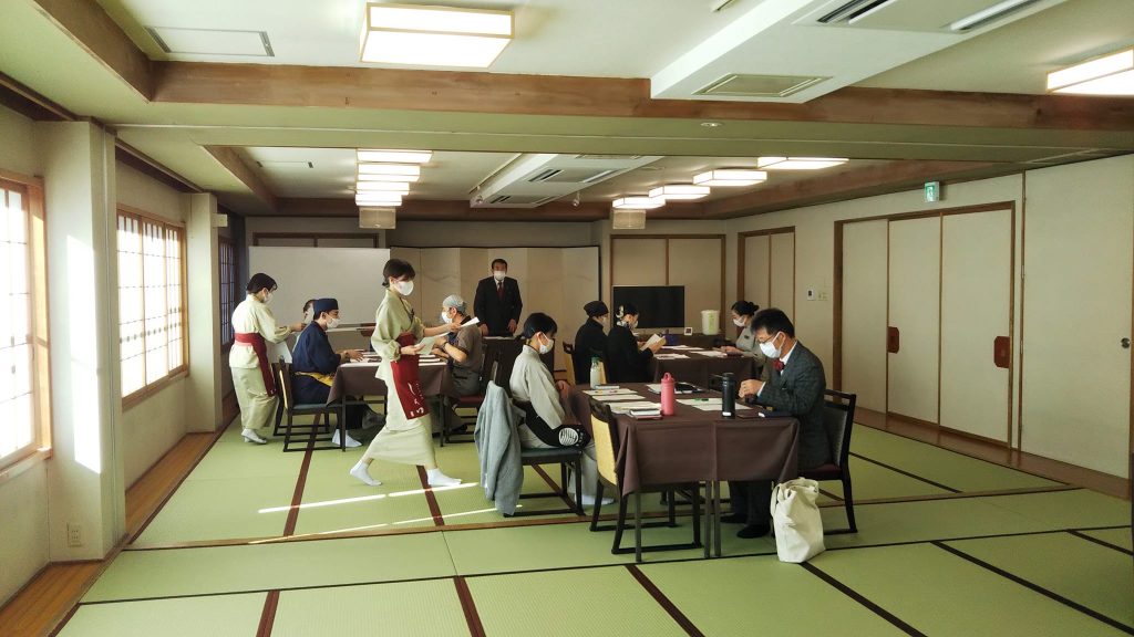 一定期間のなか数回にわたって開催される講習ですが、今年も例年同様、接客チームを始め、清掃や調理、全部署のスタッフが参加し、基本の挨拶やお辞儀・姿勢、接客場面の細かな所作から初心に返って学びなおしました。