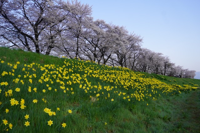 鯉のぼりや河川、青空、水仙などとのコントラストで