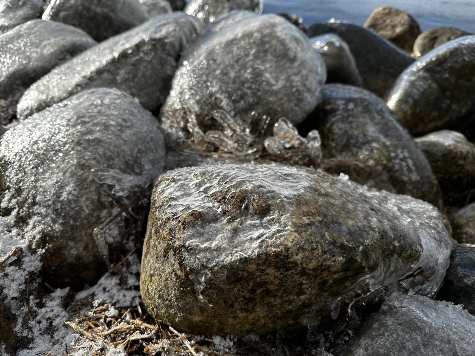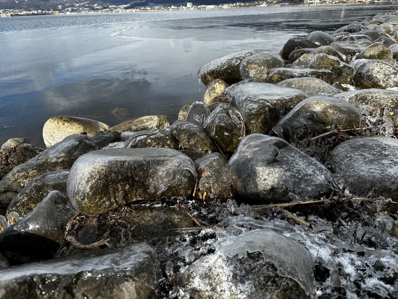 諏訪湖間欠泉センター付近では諏訪湖がうっすらと氷が張っている箇所が見られ、諏訪湖のしぶきを浴びた石や木も氷に覆われておりました。
