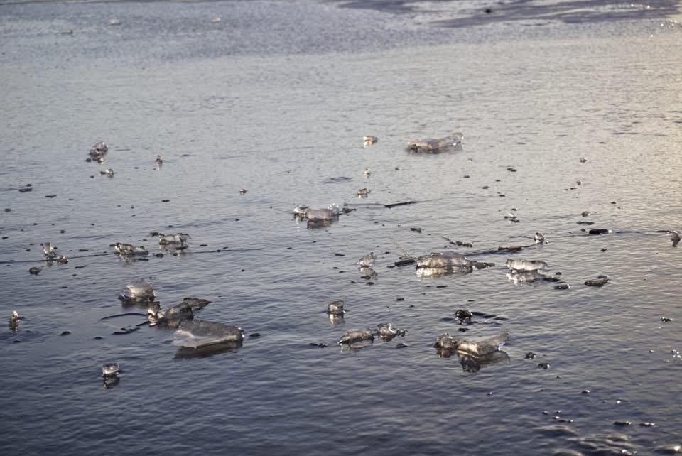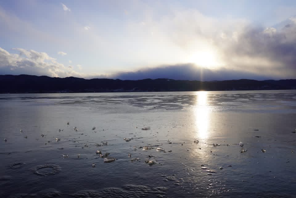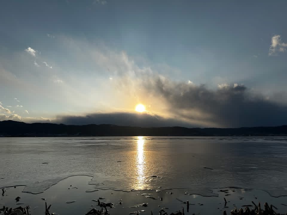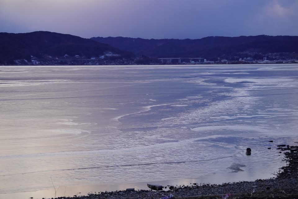 本日の立石公園と湖畔公園足湯付近の諏訪湖の様子です。半分近くは薄氷が張っていますが、波立っている箇所も見られました。氷が夕日色に輝き幻想的でした。
