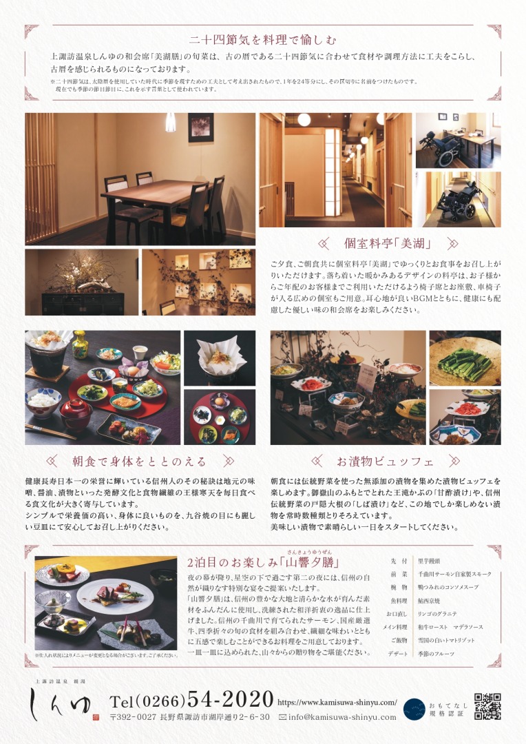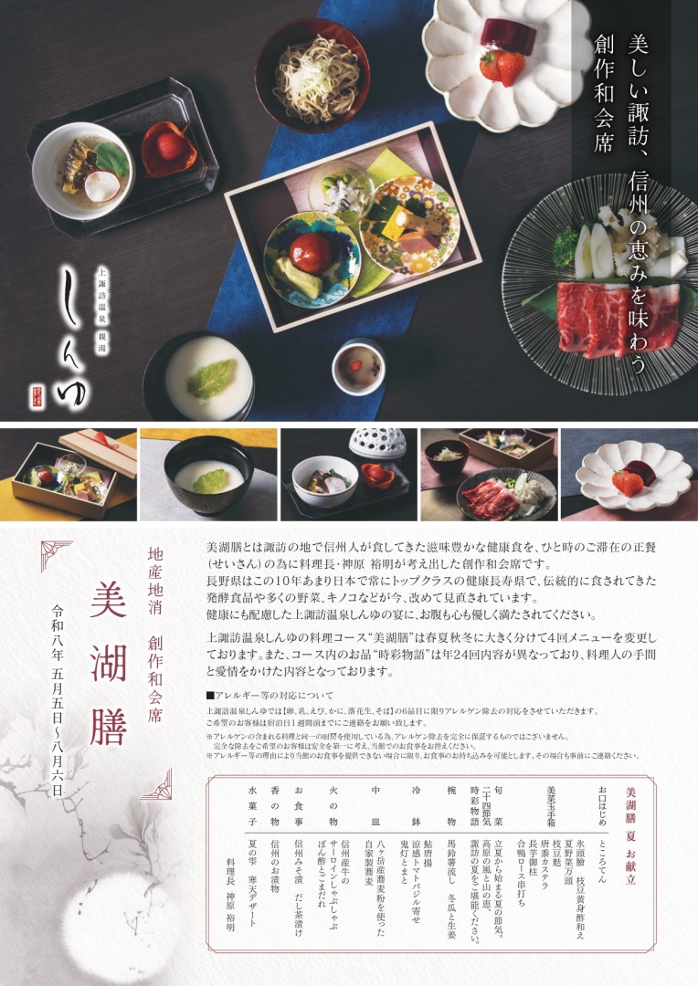 諏訪の夏をお楽しみください。お食事は個室料亭美湖にてご提供いたします。