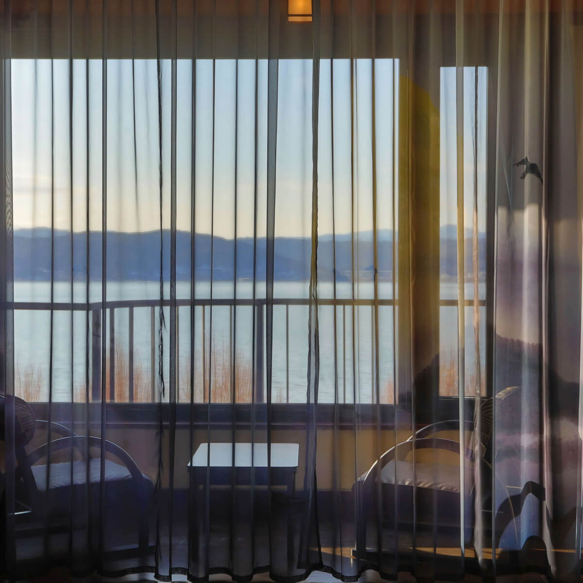 内装は主室と広縁を水墨画が描かれたオリジナルレースカーテンで隔て、背景にうっすら覗く諏訪湖の景色を絵画のように見立てました。